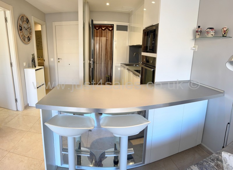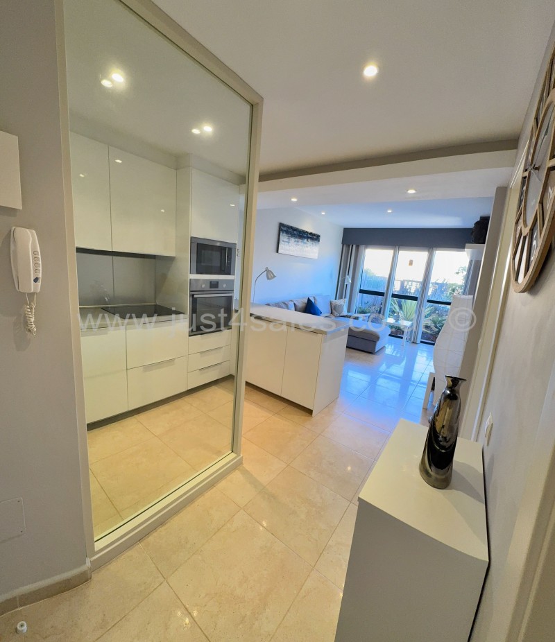 El apartamento de esquina y en planta baja, se vende amueblado y equipado. Se encuentra en la tranquila Urbanización Atalaya Park y tiene un amplio jardín con orientación sureste con vistas a la gran piscina comunitaria. La propiedad consta de un dormitorio doble con armario empotrado, baño con bañera y dos lavamanos con encimera de mármol, moderna cocina totalmente equipada con cuarto de lavado y amplio salón. El salón y el dormitorio dan acceso a la terraza y al jardín. La urbanización está cerrada y tiene bonita piscina comunitaria.
